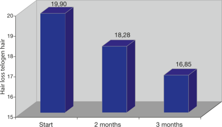De 'haar-trek' test toonde al na 2-maanden gebruik van de cafeïnehoudende liquid een beduidende afname aan van telogene haren (haren in de inactieve rustfase), het aantal telogone haren was na 4 maanden nog verder afgenomen (Grafiek 1).