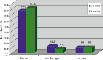 Na twee maanden was bij 77,5 % van alle testpersonen een positieve tendens waarneembaar, na nog eens 2 maanden was dit percentage gestegen tot 82,5% (Grafiek 2).