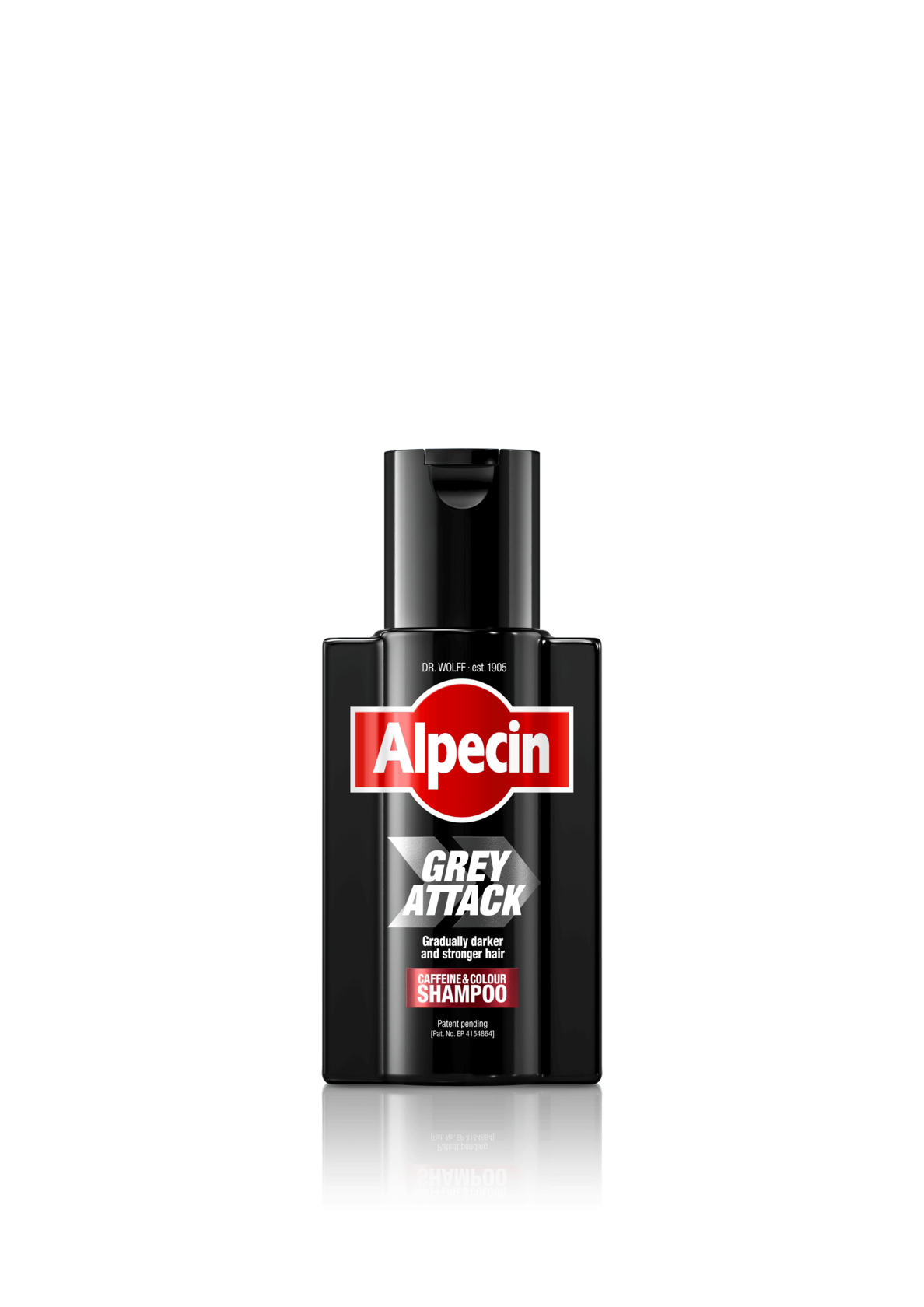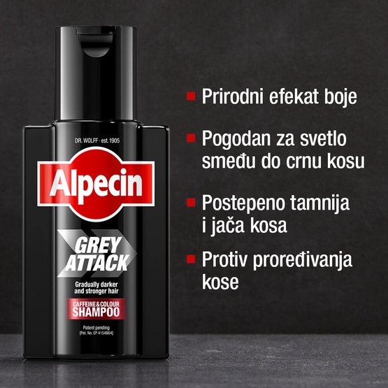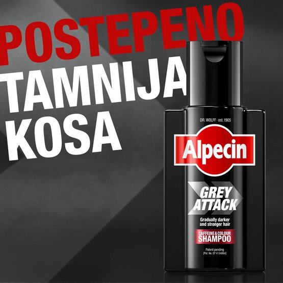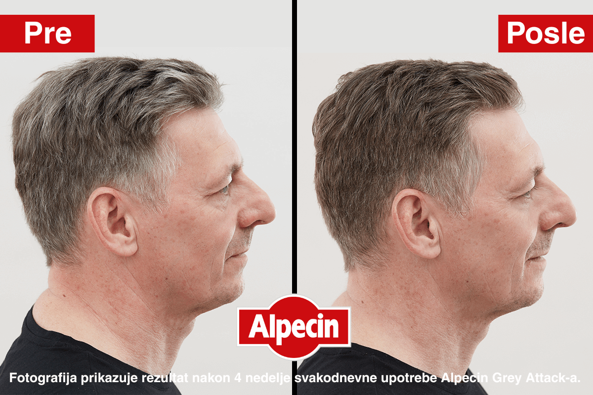 Za sve muškarce koji žele da urade nešto sa svojim (prvim) sedim vlasima, novi Alpecin Grey Attack Caffeine & Color šampon pruža najbolje muškoj kosi koja počinje da sedi: mogućnost da ponovo postepeno postane tamnija za samo dva do pet minuta tokom pranja kose – sa prirodnim efektom boje!