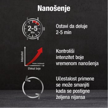 Ostavite da deluje na kosi 2 - 5 minuta pre ispiranja. Duže zadržavanje na kosi pojačava efekat boje! Koristite svakodnevno u prvim nedeljama dok ne postignete željenu boju. Zatim nastavite da koristite naizmenično sa običnim šamponom, kako biste održali boju. Intenzitet boje se može kontrolisati učestalošću i vremenom primene.