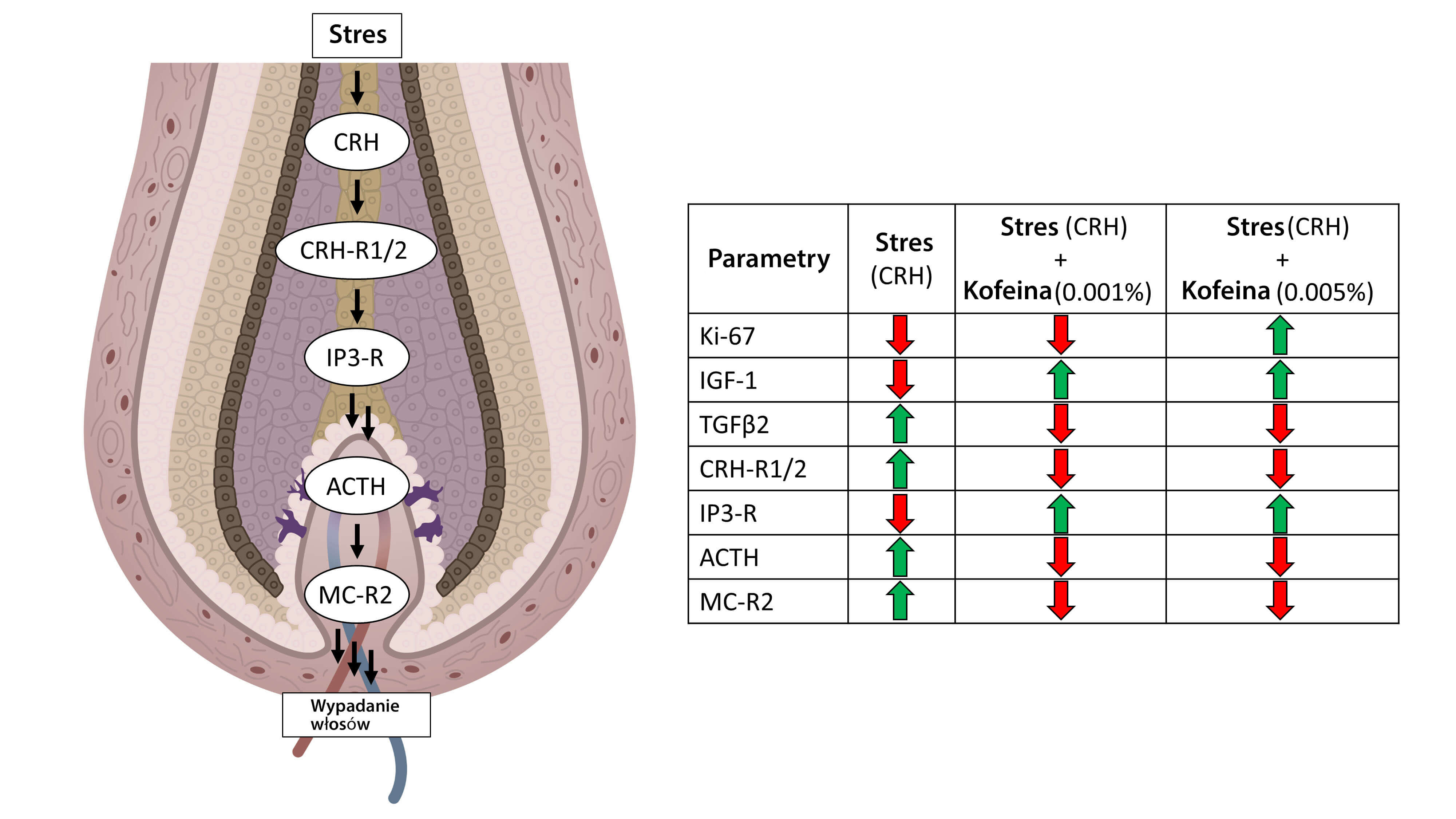W porównaniu z eksperymentem kontrolnym, CRH znacząco zwiększył ekspresję niektórych markerów, takich jak faza katagenowa inicjująca TGF-β2 (p<0,001), receptory CRH 1/2 (p<0,01), ACTH (p<0,001) i receptor melanokortyny-2 (MC-R2) (p<0,001), jak również inne parametry związane ze stresem, takie jak substancja P i receptor neurotrofin p75 w tym modelu. Dla kontrastu, CRH hamowało proliferację keratynocytów macierzy, a także ekspresję IGF-1, markera wpływającego na fazę anagenu i proproliferacyjnego receptora czynnika wzrostu nerwów (TrkA).
