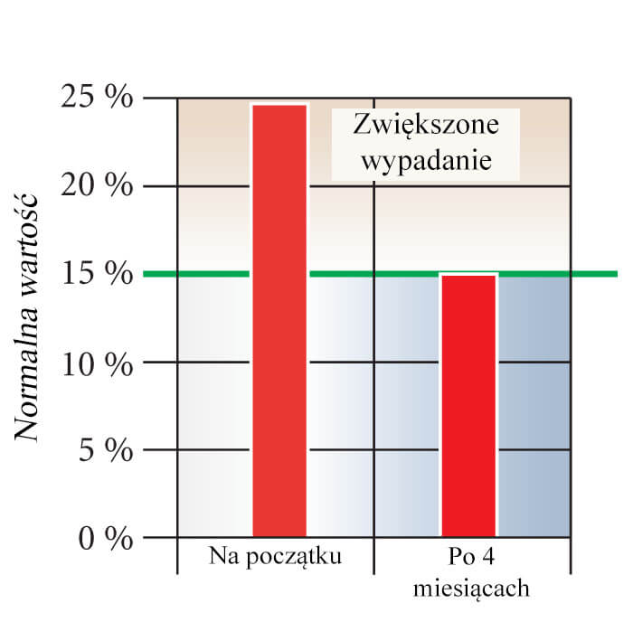 Aktywność cebulek włosów u osób badanych była początkowo wyraźnie osłabiona: średnio w fazie spoczynku trwało 22% cebulek.