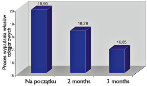 Test pociągania włosów wykazał znaczny spadek włosów telogenowych (czyli znajdujących się w nieaktywnej fazie spoczynku) już po dwóch miesiącach stosowania płynu zawierającego kofeinę, a dalsza znacząca poprawa została odnotowana po czterech miesiącach (Wykres 1).